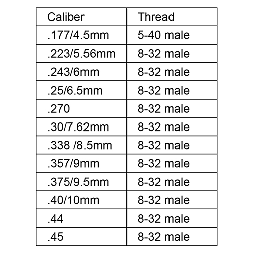.177, .22, 6 มม., .25, .27, .30, .338, .35, .357, .40, .44, .45, .50cal.