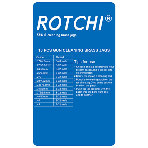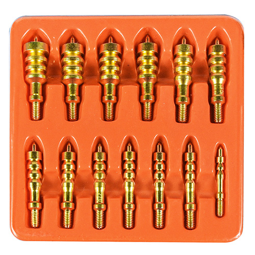 ด้ามทองเหลืองสำหรับทำความสะอาดปืน 13 ชิ้น ชุด แพ็คเกจบัตรตุ่ม ขนาด: .177, .22, 6 มม., .25, .27, .30, .338, .35, .357, .40, .44, .45, .50cal.