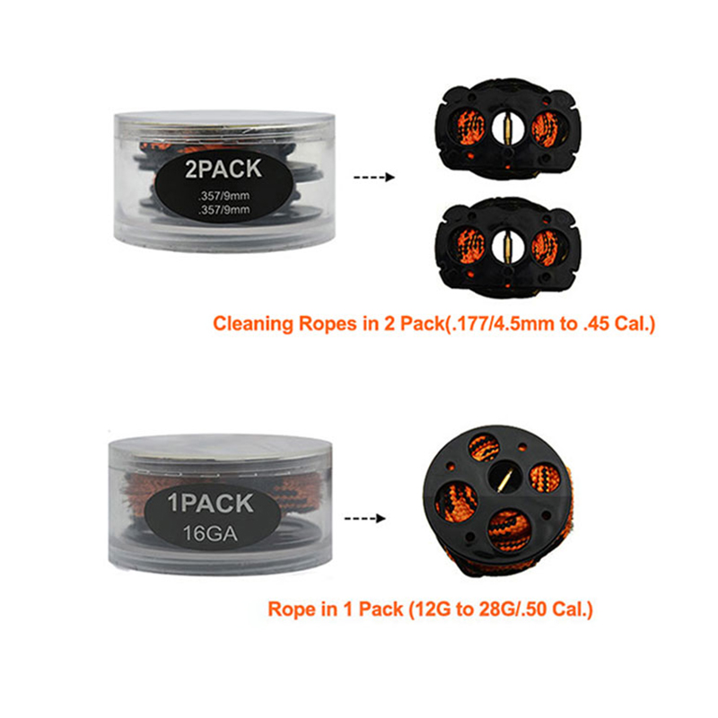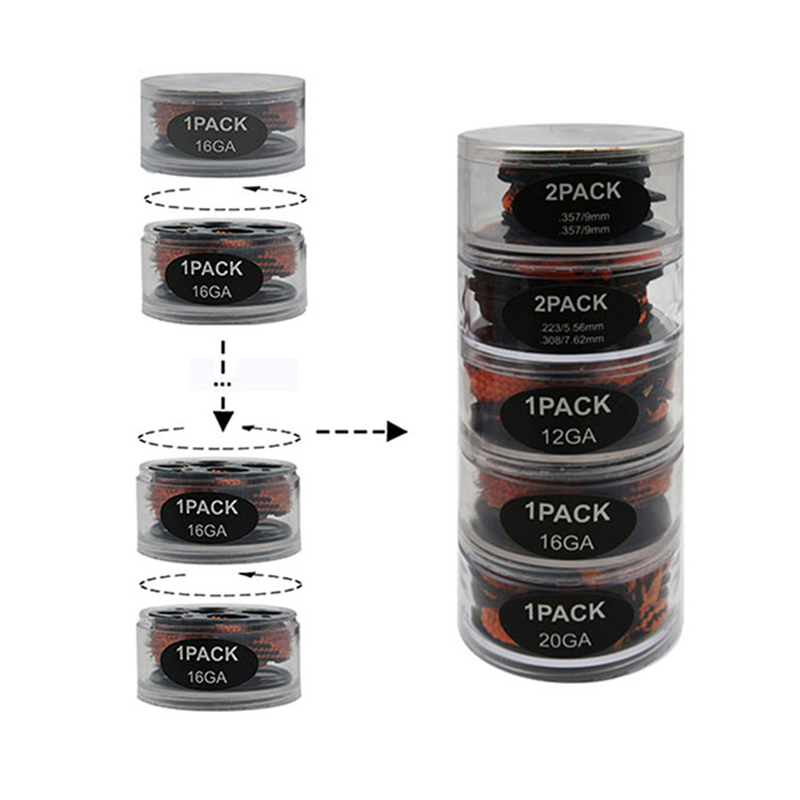 ปืนทำความสะอาดเชือกงูหลายชั้นแพ็ค DIY กระสุนและปริมาณรวมกัน การทำความสะอาดปืนเจาะเชือกงูหลายชั้น กระบอกสูบหลายชั้นนี้ประกอบด้วยเชือกทำความสะอาดปืนงูเจาะหลายเส้นที่คาลิเบอร์ต่างๆ สะดวกในการจัดเก็บและสะสม แกนด้านในไม่เพียงแต่สามารถใช้เป็นแกนม้วนเชือกเท่านั้น แต่ยังใช้เป็นที่จับดึงอีกด้วย แพ็คเกจทรงกระบอกนั้นหาได้ง่ายกว่าแพ็คเกจเดียว การออกแบบได้รับการจดสิทธิบัตรโดย Rotchi