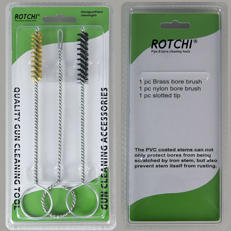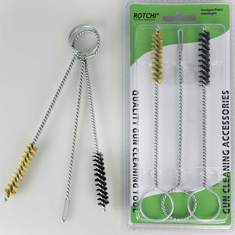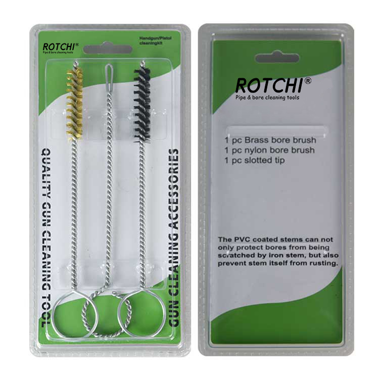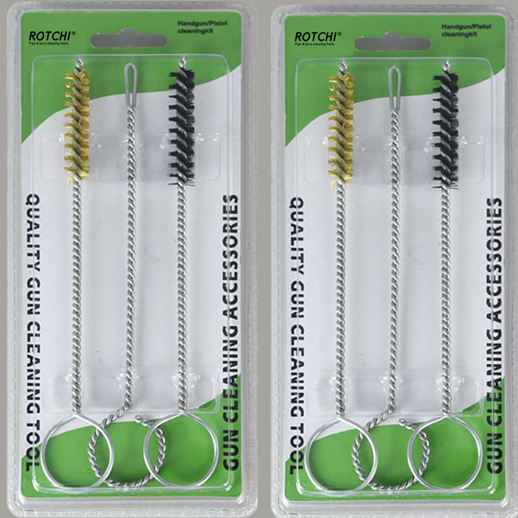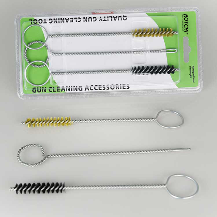ชุดทำความสะอาดปืนพก sethandgun 3 ชิ้นบรรจุในตุ่มคู่ แปรงทำความสะอาดรูทองเหลืองหนึ่งอัน แปรงทำความสะอาดรูไนลอนหนึ่งอัน และที่ยึดแพทช์แบบมีรูหนึ่งอัน มีประโยชน์และมีประสิทธิภาพ