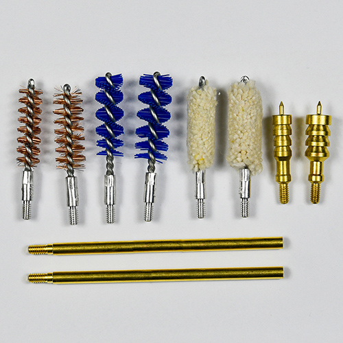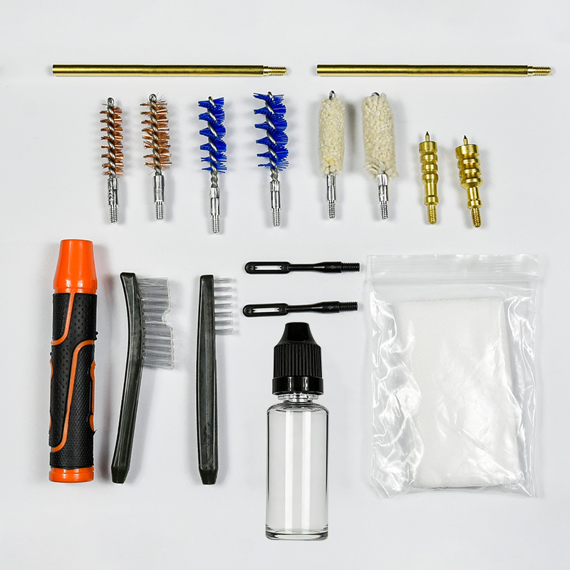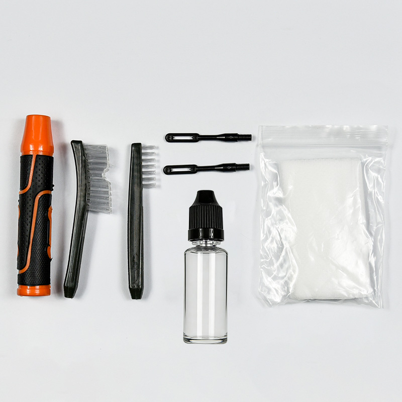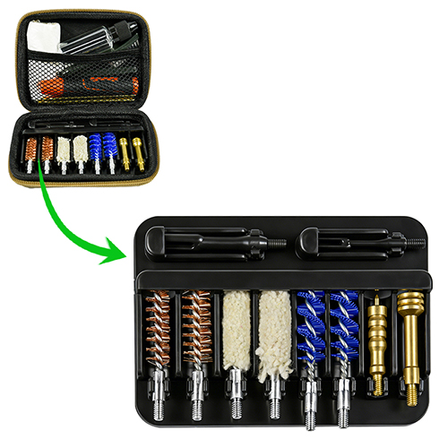 ชุดทำความสะอาดปืนพกมี 2 ขนาด (9 มม. และ .45 แคล) เคลือบผ้า OX กล่องพีวีซีมีซิป แปรงทองเหลือง, ไม้ถูพื้น, แปรงไนลอน, ด้ามทองเหลือง, 2 แท่ง ทรายและสีดำสำหรับเลือก